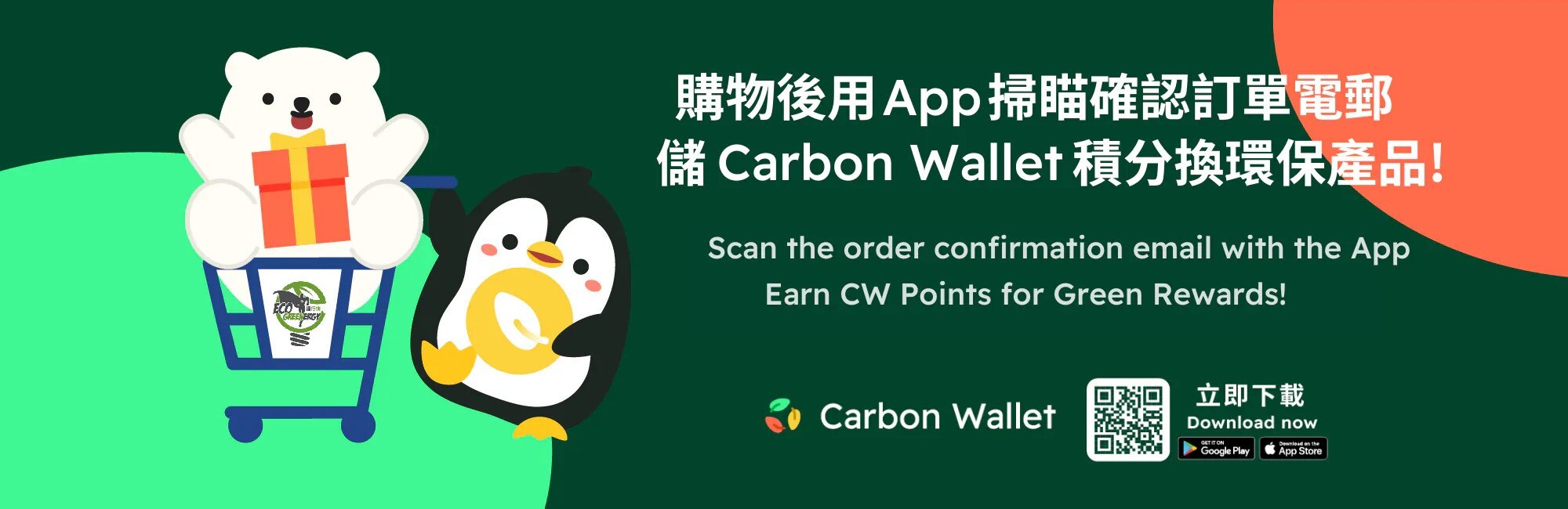 為鼓勵用戶實踐及支持綠色消費,在我們 綠行俠 網上商店購物後,使用Carbon Wallet手機應用程式掃瞄確認訂單電郵,即可賺取Carbon Wallet積分!