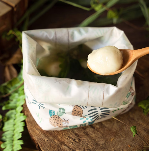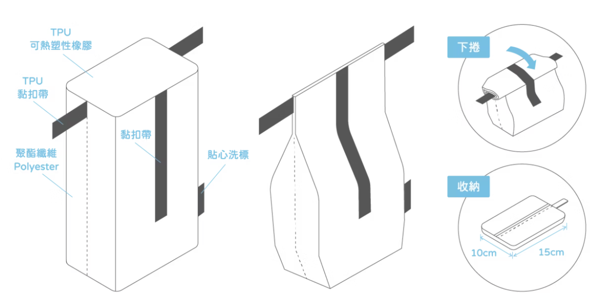 此產品由台灣製造和設計,它經過SGS檢驗,內層材質耐熱溫度達120℃。它耐熱防水,可以直接接觸食物。它可依照內容物變化大小,收納至15x9厘米左右的大小。它能取代和減少製造塑膠袋。